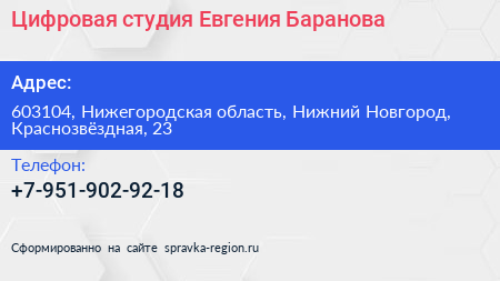 Цифровая студия Евгения Баранова по адресу 603104, Нижегородская область, Нижний Новгород, Краснозвёздная, 23 в дальнейшем Организация, размещена в следующих категориях: