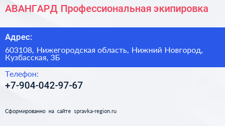 АВАНГАРД Профессиональная экипировка по адресу 603108, Нижегородская область, Нижний Новгород, Кузбасская, 3Б в дальнейшем Организация, размещена в следующих категориях: