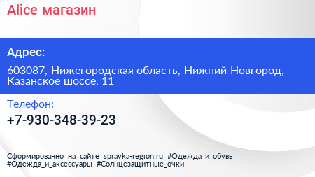 Alice, магазин по адресу 603087, Нижегородская область, Нижний Новгород, Казанское шоссе, 11 в дальнейшем Организация, размещена в следующих категориях: