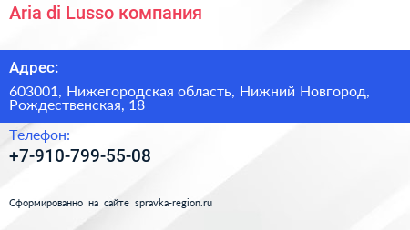 Aria di Lusso, компания по адресу 603001, Нижегородская область, Нижний Новгород, Рождественская, 18 в дальнейшем Организация, размещена в следующих категориях: