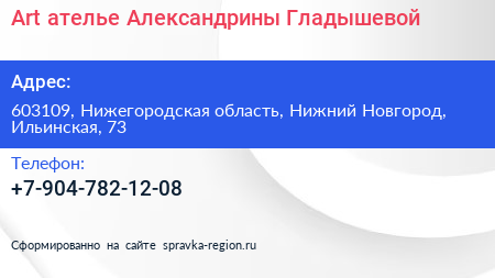 Art-ателье Александрины Гладышевой по адресу 603109, Нижегородская область, Нижний Новгород, Ильинская, 73 в дальнейшем Организация, размещена в следующих категориях: