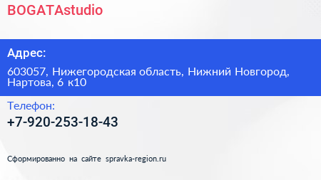 BOGATAstudio по адресу 603057, Нижегородская область, Нижний Новгород, Нартова, 6 к10 в дальнейшем Организация, размещена в следующих категориях:
