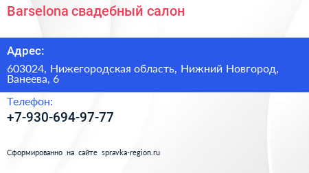 Barselona, свадебный салон по адресу 603024, Нижегородская область, Нижний Новгород, Ванеева, 6 в дальнейшем Организация, размещена в следующих категориях: