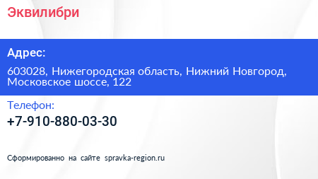 Эквилибри по адресу 603028, Нижегородская область, Нижний Новгород, Московское шоссе, 122 в дальнейшем Организация, размещена в следующих категориях: