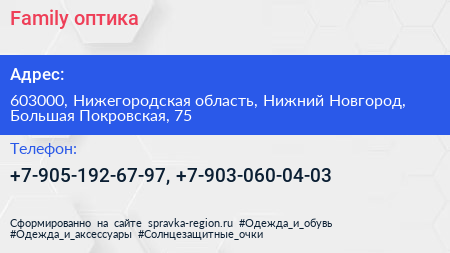 Family, оптика по адресу 603000, Нижегородская область, Нижний Новгород, Большая Покровская, 75 в дальнейшем Организация, размещена в следующих категориях: