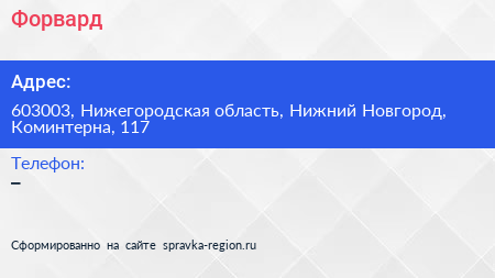 Форвард по адресу 603003, Нижегородская область, Нижний Новгород, Коминтерна, 117 в дальнейшем Организация, размещена в следующих категориях: