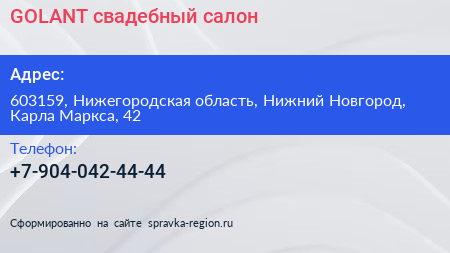 GOLANT, свадебный салон по адресу 603159, Нижегородская область, Нижний Новгород, Карла Маркса, 42 в дальнейшем Организация, размещена в следующих категориях: