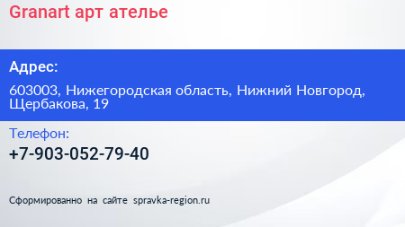 Granart, арт-ателье по адресу 603003, Нижегородская область, Нижний Новгород, Щербакова, 19 в дальнейшем Организация, размещена в следующих категориях: