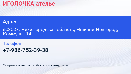 ИГОЛОЧКА, ателье по адресу 603037, Нижегородская область, Нижний Новгород, Коммуны, 14 в дальнейшем Организация, размещена в следующих категориях: