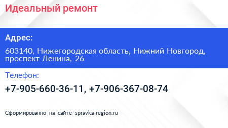 Идеальный ремонт по адресу 603140, Нижегородская область, Нижний Новгород, проспект Ленина, 26 в дальнейшем Организация, размещена в следующих категориях: