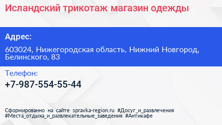 Исландский трикотаж, магазин одежды по адресу 603024, Нижегородская область, Нижний Новгород, Белинского, 83 в дальнейшем Организация, размещена в следующих категориях: