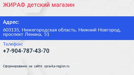 ЖИРАФ, детский магазин по адресу 603135, Нижегородская область, Нижний Новгород, проспект Ленина, 51 в дальнейшем Организация, размещена в следующих категориях: