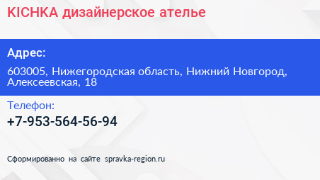 KICHKA, дизайнерское ателье по адресу 603005, Нижегородская область, Нижний Новгород, Алексеевская, 18 в дальнейшем Организация, размещена в следующих категориях: