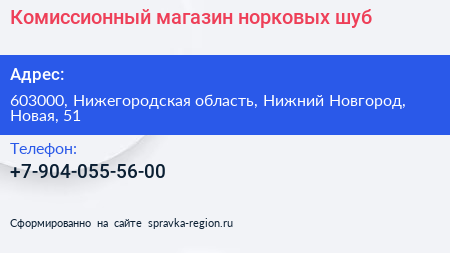 Комиссионный магазин норковых шуб по адресу 603000, Нижегородская область, Нижний Новгород, Новая, 51 в дальнейшем Организация, размещена в следующих категориях: