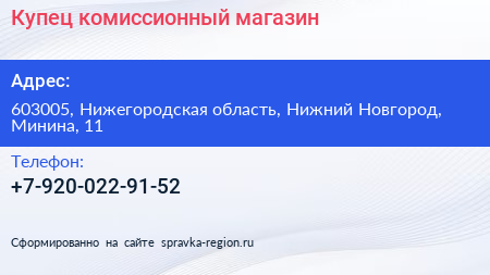 Купец, комиссионный магазин по адресу 603005, Нижегородская область, Нижний Новгород, Минина, 11 в дальнейшем Организация, размещена в следующих категориях: