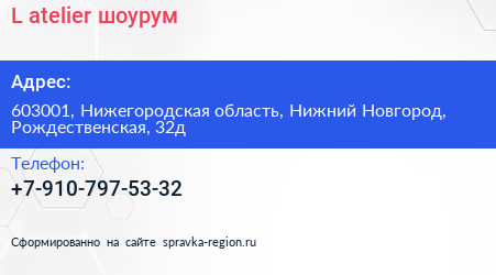 L`atelier, шоурум по адресу 603001, Нижегородская область, Нижний Новгород, Рождественская, 32д в дальнейшем Организация, размещена в следующих категориях: