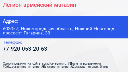 Легион, армейский магазин по адресу 603057, Нижегородская область, Нижний Новгород, проспект Гагарина, 38 в дальнейшем Организация, размещена в следующих категориях: