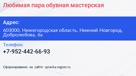 Любимая пара, обувная мастерская по адресу 603000, Нижегородская область, Нижний Новгород, Добролюбова, 6а в дальнейшем Организация, размещена в следующих категориях: