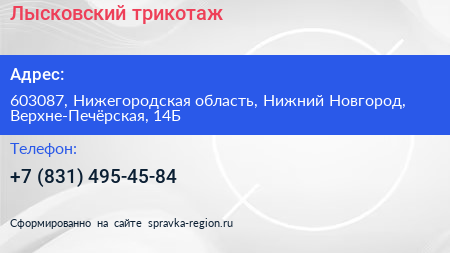Лысковский трикотаж по адресу 603087, Нижегородская область, Нижний Новгород, Верхне-Печёрская, 14Б в дальнейшем Организация, размещена в следующих категориях: