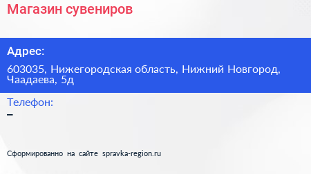 Магазин сувениров по адресу 603035, Нижегородская область, Нижний Новгород, Чаадаева, 5д в дальнейшем Организация, размещена в следующих категориях: