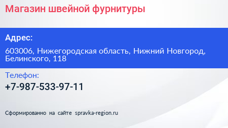 Магазин швейной фурнитуры по адресу 603006, Нижегородская область, Нижний Новгород, Белинского, 118 в дальнейшем Организация, размещена в следующих категориях:
