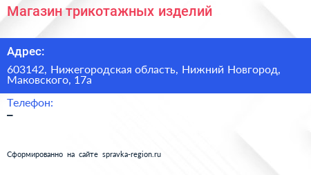 Магазин трикотажных изделий по адресу 603142, Нижегородская область, Нижний Новгород, Маковского, 17а в дальнейшем Организация, размещена в следующих категориях: