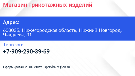 Магазин трикотажных изделий по адресу 603035, Нижегородская область, Нижний Новгород, Чаадаева, 31 в дальнейшем Организация, размещена в следующих категориях: