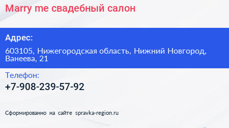 Marry me, свадебный салон по адресу 603105, Нижегородская область, Нижний Новгород, Ванеева, 21 в дальнейшем Организация, размещена в следующих категориях: