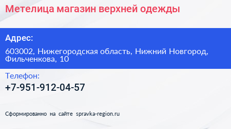 Метелица, магазин верхней одежды по адресу 603002, Нижегородская область, Нижний Новгород, Фильченкова, 10 в дальнейшем Организация, размещена в следующих категориях: