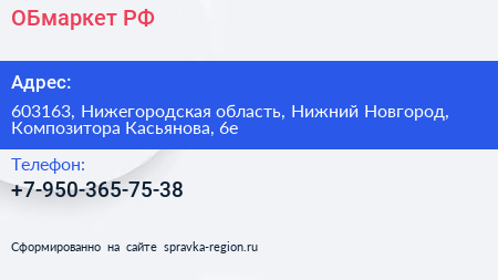 ОБмаркет.РФ по адресу 603163, Нижегородская область, Нижний Новгород, Композитора Касьянова, 6е в дальнейшем Организация, размещена в следующих категориях: