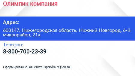 Олимпик, компания по адресу 603147, Нижегородская область, Нижний Новгород, 6-й микрорайон, 21а в дальнейшем Организация, размещена в следующих категориях:
