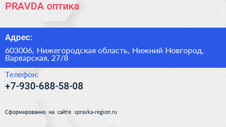 PRAVDA, оптика по адресу 603006, Нижегородская область, Нижний Новгород, Варварская, 27/8 в дальнейшем Организация, размещена в следующих категориях: