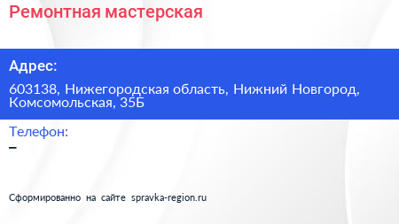 Ремонтная мастерская по адресу 603138, Нижегородская область, Нижний Новгород, Комсомольская, 35Б в дальнейшем Организация, размещена в следующих категориях: