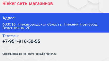 Rieker, сеть магазинов по адресу 603016, Нижегородская область, Нижний Новгород, Веденяпина, 2Б в дальнейшем Организация, размещена в следующих категориях: