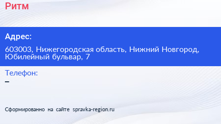 Ритм по адресу 603003, Нижегородская область, Нижний Новгород, Юбилейный бульвар, 7 в дальнейшем Организация, размещена в следующих категориях:
