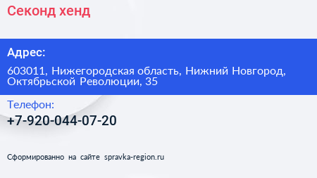 Секонд-хенд по адресу 603011, Нижегородская область, Нижний Новгород, Октябрьской Революции, 35 в дальнейшем Организация, размещена в следующих категориях: