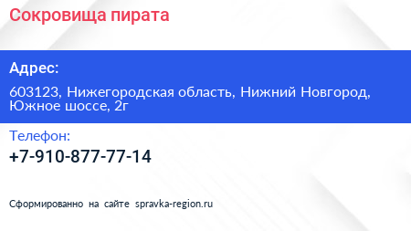 Сокровища пирата по адресу 603123, Нижегородская область, Нижний Новгород, Южное шоссе, 2г в дальнейшем Организация, размещена в следующих категориях: