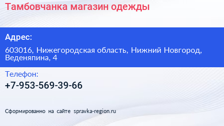 Тамбовчанка, магазин одежды по адресу 603016, Нижегородская область, Нижний Новгород, Веденяпина, 4 в дальнейшем Организация, размещена в следующих категориях: