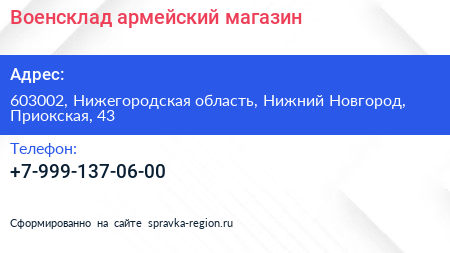 Военсклад, армейский магазин по адресу 603002, Нижегородская область, Нижний Новгород, Приокская, 43 в дальнейшем Организация, размещена в следующих категориях: