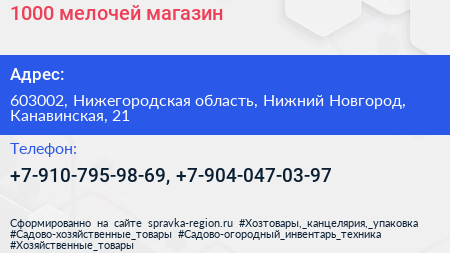 1000 мелочей, магазин по адресу 603002, Нижегородская область, Нижний Новгород, Канавинская, 21 в дальнейшем Организация, размещена в следующих категориях: