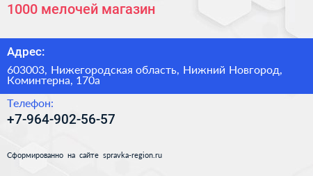 1000 мелочей, магазин по адресу 603003, Нижегородская область, Нижний Новгород, Коминтерна, 170а в дальнейшем Организация, размещена в следующих категориях: