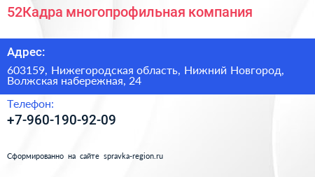 52Кадра, многопрофильная компания по адресу 603159, Нижегородская область, Нижний Новгород, Волжская набережная, 24 в дальнейшем Организация, размещена в следующих категориях: