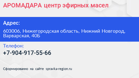 АРОМАДАРА, центр эфирных масел по адресу 603006, Нижегородская область, Нижний Новгород, Варварская, 40Б в дальнейшем Организация, размещена в следующих категориях:
