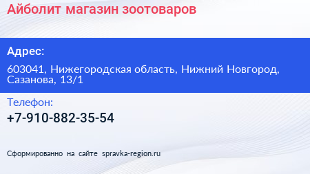 Айболит, магазин зоотоваров по адресу 603041, Нижегородская область, Нижний Новгород, Сазанова, 13/1 в дальнейшем Организация, размещена в следующих категориях: