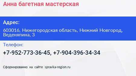 Анна, багетная мастерская по адресу 603016, Нижегородская область, Нижний Новгород, Веденяпина, 3 в дальнейшем Организация, размещена в следующих категориях: