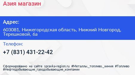 Азия, магазин по адресу 603081, Нижегородская область, Нижний Новгород, Терешковой, 6а в дальнейшем Организация, размещена в следующих категориях: