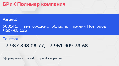 БРиК Полимер, компания по адресу 603141, Нижегородская область, Нижний Новгород, Ларина, 12Б в дальнейшем Организация, размещена в следующих категориях: