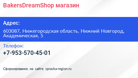 BakersDreamShop, магазин по адресу 603087, Нижегородская область, Нижний Новгород, Академическая, 5 в дальнейшем Организация, размещена в следующих категориях:
