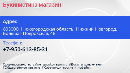 Букинистика, магазин по адресу 603000, Нижегородская область, Нижний Новгород, Большая Покровская, 48 в дальнейшем Организация, размещена в следующих категориях: