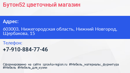 Бутон52, цветочный магазин по адресу 603003, Нижегородская область, Нижний Новгород, Щербакова, 15 в дальнейшем Организация, размещена в следующих категориях: